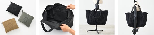 ※左からパッカブルの状態、バッグの内装、手持ち、肩掛けしたイメージ。