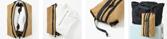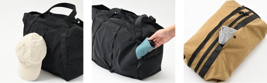 ※左からシューズ、衣服を収納するイメージ。ハンドルスナップと他のバッグへ取り付けたイメージ。
