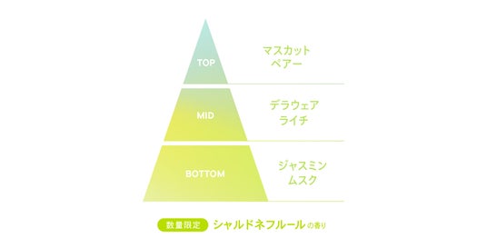 みずみずしいマスカットとペアーをトップに、デラウェアのジューシーな果実味が重なり、透明感のある華やかさを演出。ラストはジャスミンのやわらかなフローラルノートとムスクの心地よい余韻が広がり、洗練された上品な香りで満たします。
