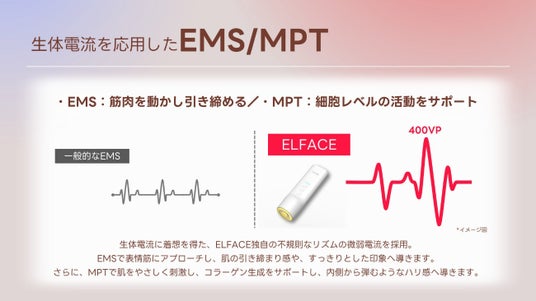 生体電流に着想を得た独自のEMS/MPT技術により、 表情筋へしっかりアプローチしながら、肌をやさしく刺激し、引き締まりと内側から弾むようなハリ感を同時にサポートします。