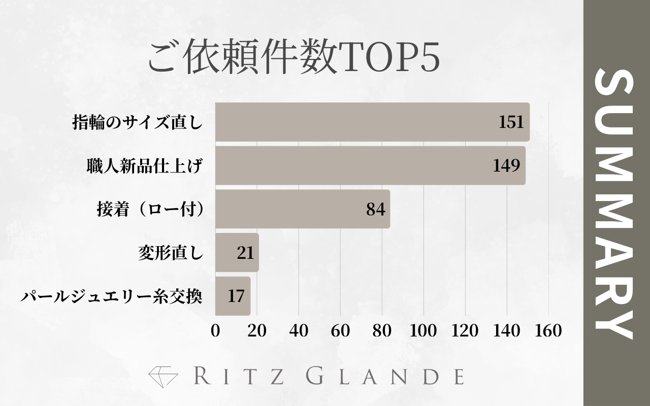 北海道札幌市のジュエリー修理・リフォーム専門店のRITZ GLANDEは、2025年7月~12月にご依頼いただいた内容を集計いたしましたので上位5位までをランキング別にご紹介します。