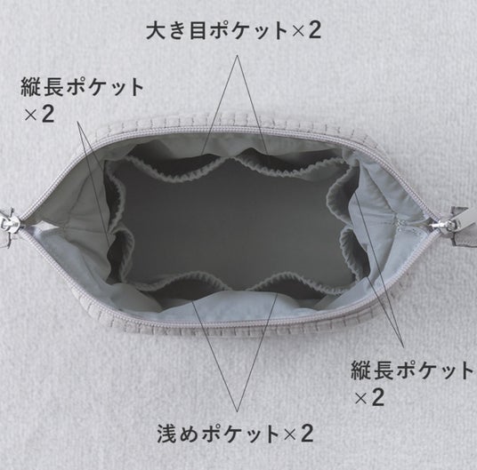 また化粧品が飛び出さないように、全てのポケットをギャザー仕様にしています。