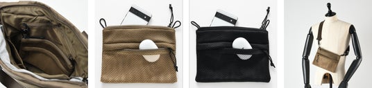 ※左からバッグ内に設置された状態、整理ポーチのグレージュとブラック、ミニショルダーバッグにした際のイメージ。