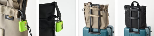 ※左からトート・ヘルメットバッグのファスナー引手と丸カンを施錠、スーツケースに連結させたイメージ。 ※本製品にパドロックは付属しません。