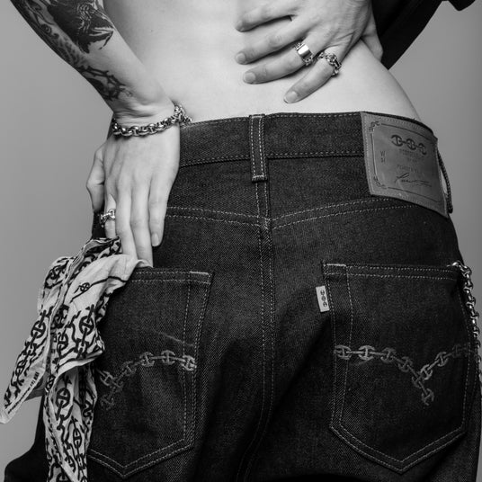 更に日本では初の取り扱いとなるスペシャルピース、時代を超越したワークウェアをモダンにアレンジしたHOORSENBUHSこだわりのデニムが登場。150年以上にわたりデニムの世界的スタンダードであり続けてきたアメリカの定番モデルをベースに、現代的な感性とクラフツマンシップを融合させた一本です。ポケットやボタンフライなどのディテールには、ブランドを象徴するスターリングシルバー製のボルトを採用。さらに、カスタムバックポケットの上にはHOORSENBUHS社製のレザーパッチが縫い付けられ、トライ・リンクの刺繍もあしらわれています。細部にまで宿るブランドの美学が際立つ、唯一無二のデニムです。