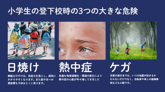 当社は、紫外線対策・熱中症対策・けが予防・防災にも役立つ1つの通学帽子を企画・開発しました。これを全国の小学生にかぶって欲しいと願っています。