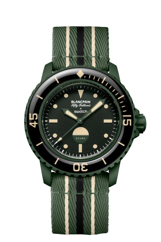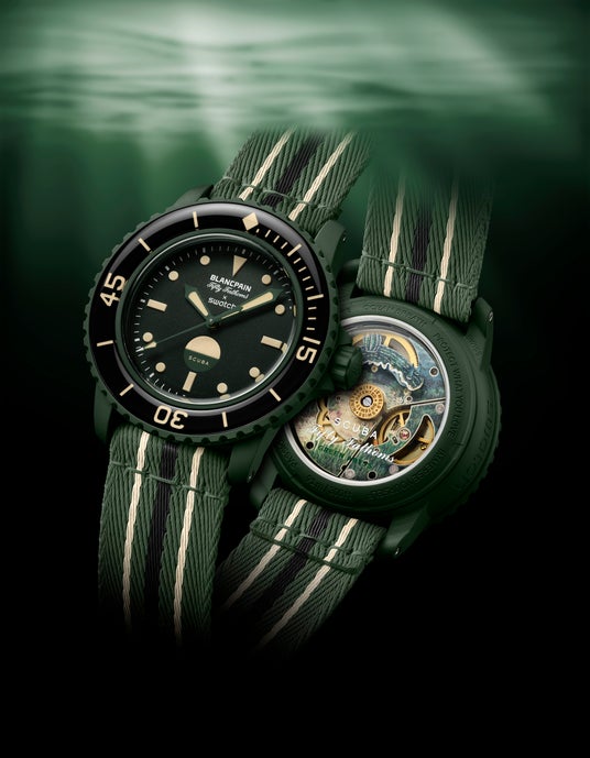 GREEN ABYSSの文字盤にはブランパンのヴィンテージロゴが配され、コレクターの間で人気の高いディテールとなっています。また、文字盤とクラウンにはブランパンとSwatchのコラボレーションを称えるロゴがあしらわれ、NATOスタイルの2ピースのストラップ、そしてFifty Fathomsのアイコニックなシルエットを想起させるケースの輪郭は、その不朽のレガシーを反映しています。