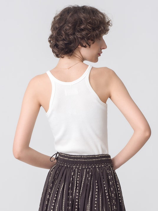 型を一から別注し、シルエットにこだわり抜いた本アイテムは、盛夏には1枚で洗練された大人のヘルシースタイルを完成されてくれます。また。季節の変わり目には開襟シャツや透け感のあるトップスのインナーとしても活躍。カップには左右一体型の成型カップを使用し、自然できれいなバストシルエットに整えます。アンダーゴムのないフリーカッティング素材は背中の段差を軽減し、ズレにくいのがポイント。ワードローブに心強いホワイトとブラックの2色で展開いたします。
