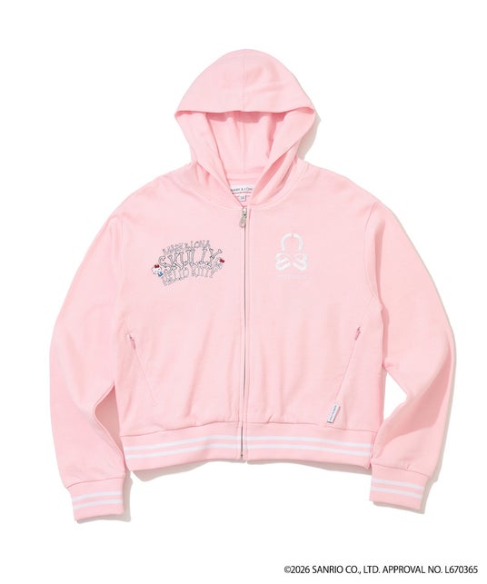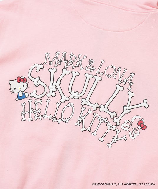 ピンク、ブラック、ホワイトの3色で展開する本作は、ハローキティとのスペシャルコラボレーションロゴ「Skully×Hello Kitty」をあしらったデザイン。胸元には今シーズンを象徴するアイコン「エレメントスカル」も施し、遊び心あふれる表情に仕上げました。発泡プリントの立体感と繊細な刺繍を組み合わせることで、ポップさの中にもMARK & LONAらしいアイコニックな存在感を演出しています。着るだけで気分が上がる、ポップでキャッチーなコラボレーションアイテムです。素材には、毛羽立ちを抑えた上質なコーマ糸による、ソフトな膨らみのコットン裏毛を採用。軽量でストレスフリーな着心地を実現しながら、ややオーバーサイズな身幅と短めの着丈を掛け合わせた、トレンド感溢れるシルエットとなっています。