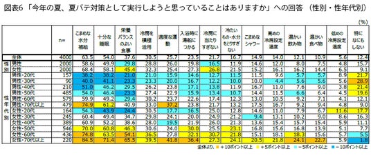 ここまで暑さ対策のアイテムについてみてきましたが、少し視点を変えて、夏バテ対策としてこの夏に実行しようと思っていることをたずねた結果が図表6です。63.5%と最多だったのが「こまめな水分補給」。これに「十分な睡眠」54.0%、「栄養バランスのよい食事」37.6%が続きました。上位3項目は夏バテ対策の「基本の“き”」ともと言えるものでしょう。「冷房を積極活用」30.5%に対し、「冷房に当たりすぎない」は21.7%と8.8ポイントの差がついたのは、猛暑を警戒してのことでしょうか。夏に避けがちな「入浴時に湯船につかる」や「温かい飲み物」「温かい食べ物」も、各23.5%・12.1%・10.9%と一定の支持を集めました。冷房による冷えや自律神経の乱れを防止・改善するために実行している人も多そうですね。男女別では、ほぼすべての項目で女性が上回るなか、「適度な運動」は0.6ポイントと僅差ながら男性が上回りました。また、各項目で50代以上の女性および70代以上男性が高値を示していますが、20代女性が「低めの冷房設定温度」が全年代で最高になったのは、冷えすぎ対策を含めてということでしょうか。