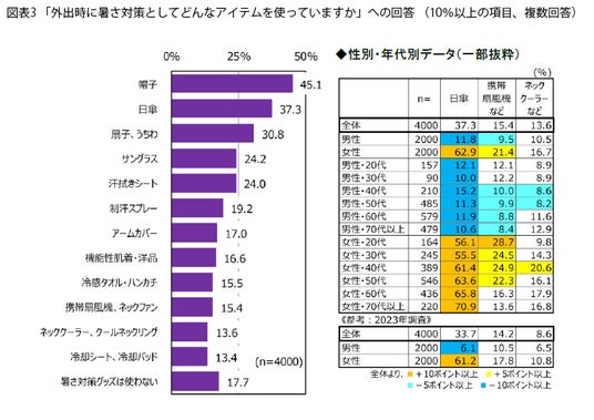 - 日中に男性は “帽子”・女性は “日傘” で暑さ対策