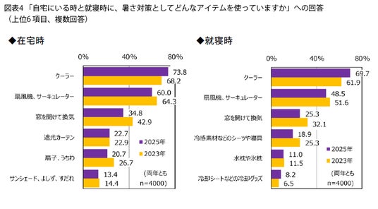 次に、在宅時と就寝時の暑さ対策アイテムを見てみると(図表4)、両シーンともに「クーラー」「扇風機、サーキュレーター」「窓を開けて換気」がベスト3となりました。上位の顔ぶれは2年前の前回調査と同じですが、比率に着目すると変化を読み取ることができます。「クーラー」と「扇風機、サーキュレーター」の差は、前回が在宅時3.9ポイント・就寝時10.3ポイントだったのが、今回は在宅時13.8ポイント・就寝時21.2ポイントと、ともに10ポイント以上拡大しています。クーラーと扇風機を併用する人も一定数いるでしょうが、従来は扇風機のみで過ごしていた人が今年はクーラーを使うケースが増えているのかもしれません。前回と比べ、「窓を開けて換気」が在宅時7.1ポイント・就寝時6.8ポイント、また在宅時の「扇子、うちわ」が6.0ポイント、就寝時の「冷感素材などのシーツや寝具」が6.4ポイントそれぞれ低下しているのも、クーラー使用が増えたことに伴うことかもしれませんね。