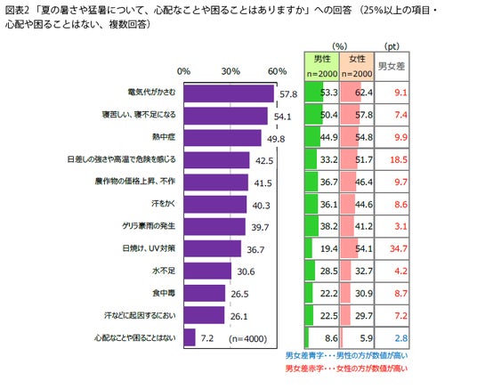 夏の暑さや猛暑について、具体的にどういったことを心配、あるいは困ると思っているのでしょうか(図表2)。57.8%と最も多くの人が挙げたのが「電気代がかさむ」。熱中症予防でクーラーの使用が推奨される一方で、電気料金も上昇していることが数字を押し上げた一因でしょうか。これに3.7ポイント差で続くのが「寝苦しい、寝不足になる」。寝苦しさで何度も目覚めてしまう、眠りが浅くて疲れが取れないなど、夏の睡眠に悩んだことがある人は多いでしょう。以下、「熱中症」49.8%をはじめ、「日差しの強さや高温で危険を感じる」「農作物の価格上昇、不作」「汗をかく」が4割超となりました。男女別では、1~3位は同じ顔触れですが、4・5位は男性「ゲリラ豪雨の発生」「農作物の価格上昇、不作」、女性「日焼け、UV対策」「日差しの強さや高温で危険を感じる」と差が。特に「日焼け、UV対策」は女性が34.7ポイント上回りました。
