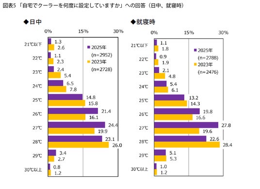 図表4で2年前と比べてクーラーの使用率が上昇していましたが、自宅でのクーラー設定温度は変化しているのでしょうか。日中と就寝時の温度を2023年の前回調査と比較したのが図表5です。今回調査で日中24.4%・就寝時27.8%と最多だったのは「27℃」となり、前回調査の「28℃」(日中26.0%、就寝時28.4%)より1度低下しました。この背景には、前回調査時は室内温度28℃を目安にするなどの「クールビズ」が提唱されていたことが関係しているのかもしれません。