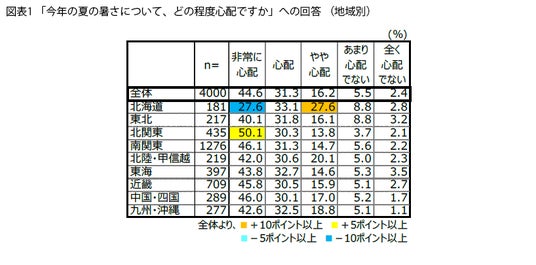 まず、今年の暑さへの心配度をたずねてみました(図表1)。「非常に心配」44.6%、「心配」31.3%と、合わせて75.9%が夏の暑さに不安を抱いていました。この一方で、「あまり」と「全く」を合計した「心配でない」人は7.9%と1割に満たない結果に。調査を行った6月下旬時点で、梅雨の降雨量が少なかったこともあわせて、すでに今年の暑さに対しての心配度を高めた人が多かったのでしょう。地域別では、「非常に心配」が50.1%、「心配」も30.3%にのぼったのが“北関東”というのも興味深いところです。2018年7月に埼玉県熊谷市で当時の国内最高気温41.1℃を記録したように、「北関東=暑い」と連想する人が多そうですが、実際に住んでいる人の8割が今年の暑さを心配していました。「非常に心配」が27.6%と最少の北海道でも、「心配」との合計は6割にのぼり、暑さへの懸念は全国的のようです。