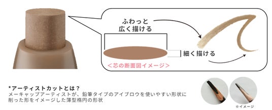 描きやすさを追求した薄型楕円の“アーティストカット芯”は、幅広い面でふんわり、細い面で眉尻をすっきりと描ける多機能形状。1本で眉全体のニュアンスを自在にコントロールできます。