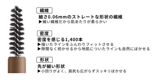 先細り形状の濃密“ブレンド&フィットブラシ”が、描いたラインを自然にぼかしてフィットするから、眉メイクが苦手な方でも失敗しにくく、仕上がりが格段にアップします。