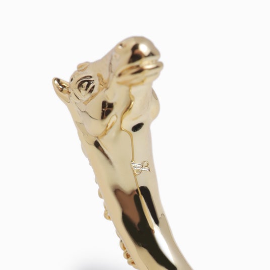 指に巻き付くような造形が印象的な、馬をモチーフにしたダブルフィンガーリング。反対側にはランダムな形のキュービックジルコニアをセッティングし、シャープさの中に華やかさをプラスしました。馬のたてがみは、連なりのあるディテールで毛並みを表現。力強さとしなやかさを併せ持つデザインが、スタイリングに存在感を与えます。