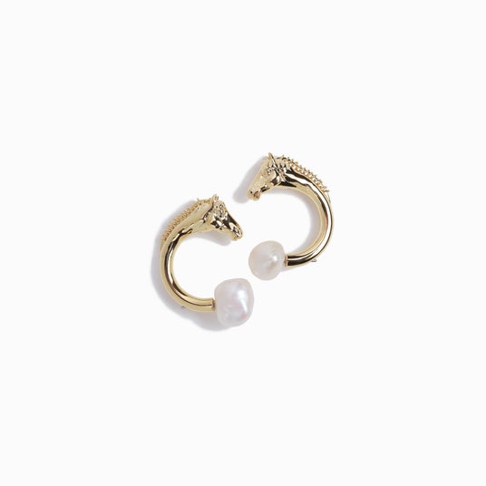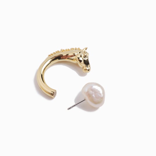 馬をモチーフにしたラッキーアイテムのフープピアス。トップは淡水パールでカジュアルさをプラス、キャッチ部分が馬モチーフに。重厚感のあるフォルムがポイントです。キャッチを通常のものにつけかえることでシシンプルな淡水パールピアスとしても使える2WAY仕様。