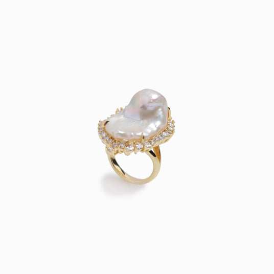 手元に視線を集める、存在感のあるデザインが魅力のリング。大振りのバロックパールを主役に、周囲へランダムに配置したキュービックジルコニアが、奥行きのある表情を生み出します。一点でコーディネートが完成するキャッチーさと、ラグジュアリーなムードを併せ持ったデザイン。同じ形がひとつとして存在しないバロックパールならではの抜け感が、フォーマルにも、あえてシンプルな装いのアクセントとしても映える一本です。