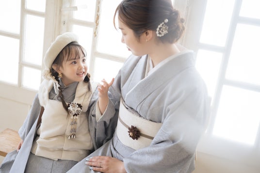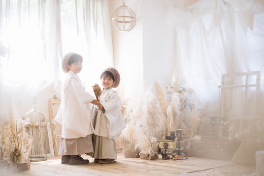 特に、ビンテージとは異なる味わいのコフレオリジナル和装は七五三撮影でも大変人気が高く、ごきょうだいやご家族様のトータルコーディネートのご提案や、お⾐装のレンタルも可能です(※3)。お宮参りの産着レンタルサービスも承っており(※4)、撮影前後1か月の期間であれば無料でご利用いただけます。