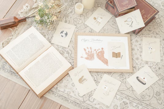 また、1歳の誕生日の行事として親しまれている「選び取り」では、コフレオリジナルの「選び取りカード」をご用意しており、選んだカードと手足型を一緒にディスプレイできる台紙プレゼントが人気の撮影メニューの一つです。