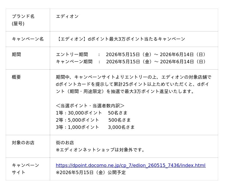 株式会社NTTドコモ(以下、ドコモ)は、「dポイント」「d払い(R)」においておトクなキャンペーンを開催いたします。詳細は、下表のとおりです。