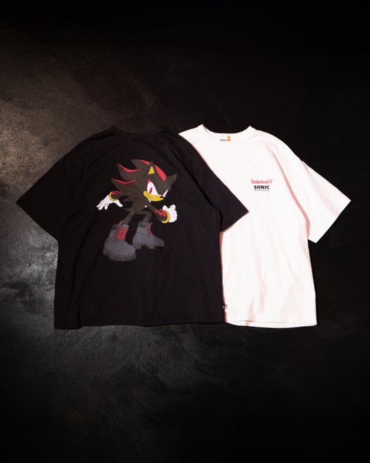 “6インチブーツ”は、特別仕様のシャドウをヒール横とハングタグに刻印し、シューレースはシャドウを彷彿とさせるレッドにアップデートすることで、遊び心と存在感を兼ね備えた1足となっています。長袖Tシャツは、特別仕様のシャドウを左胸にワンポイントであしらい、右腕に「ソニック」シリーズのタイトルロゴを、左腕にレッドのティンバーランドロゴをデザイン。一方半袖Tシャツは、特別仕様のシャドウを背面に大胆にプリントし、左胸部分に「ソニックシリーズ」のタイトルロゴとレッドのティンバーランドロゴを配置。どちらもホワイトとブラックの2カラーを用意し、ホワイトは柔らかさと発色性を兼ね備えたハーフラバープリントを採用することでヴィンテージライクな仕上がりとなり、ブラックは全体を起毛させて色を退色させるフロスト加工によりタフに着用されたかのようなフェード感を再現しています。