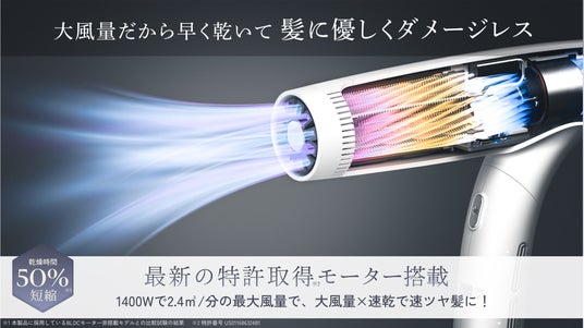 速乾とダメージケアを両立する、2.3㎥/分の大風量ドライヤーで美髪体験を。特許取得の最新小型モーターを搭載し、コンパクトながら1400Wのパワフルな風量を実現します。遠赤外線効果による低温速乾仕様で、熱ダメージを最小限に抑えつつ、しっかりと髪を乾かします。髪と頭皮を優しくケアしながら、潤いとツヤのある美しい仕上がりをお届けします。