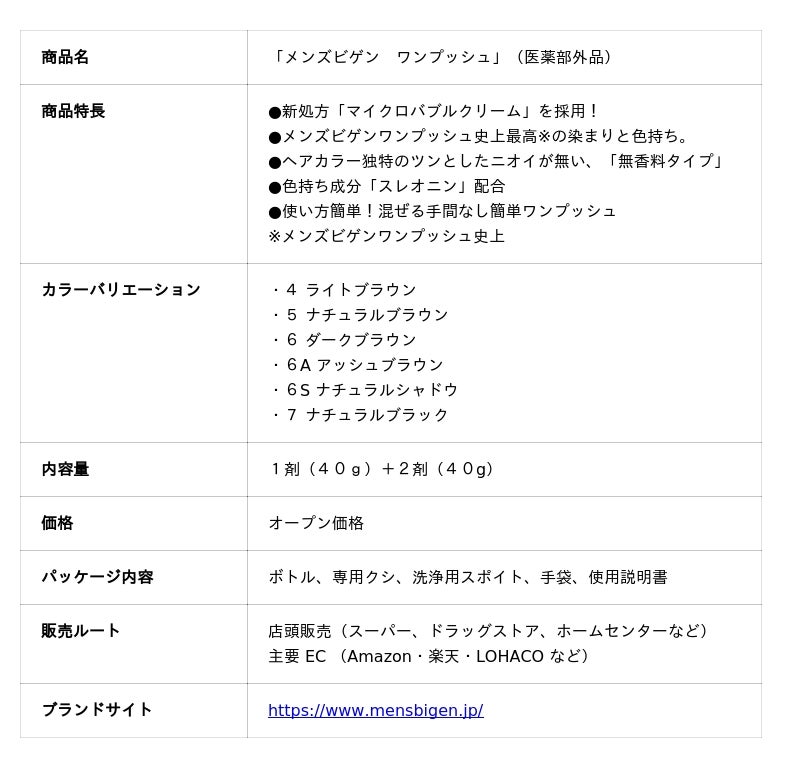 2026年1月より順次商品リニューアルを実施。染まりも色持ちも過去最高※、さらにパッケージも刷新した「メンズビゲンワンプッシュ」でより多くの白髪の悩みをもつ方たちに寄り添います。