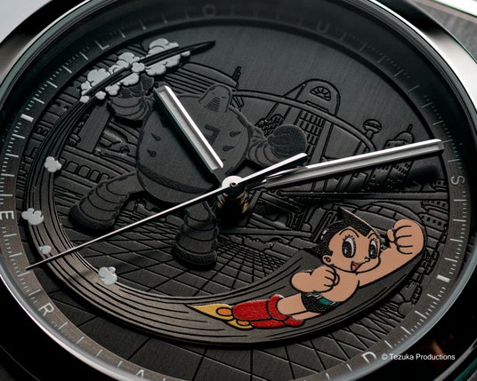 文字盤にインデックスはありません。無駄を一切省き、ただ物語のみを表現しています。このスペシャルエディションは、文字盤を映画の舞台に見立て、『鉄腕アトム』が飛び立つ世界を表現しています。6時から12時位置にかけて、文字盤には縦方向のサテンブラッシュ仕上げで「未来都市」の背景が刻まれています。多層構造により、デザインは奥行きを増しています。フルカラーの『鉄腕アトム』が、煙と雲を背景に文字盤から飛び出します。背景には、忍び寄る「地上最大のロボットの1体」、ブランドがそびえ立ち、その周囲にはチャプターリングが配置され、白いミニッツトラックがプリントされます。ミニッツトラックに配置されたロゴはスーパールミノバの輝きを放ちます。多層構造の文字盤は、『鉄腕アトム』、悪役、フランジの3つのアプライドエレメントに加え、エングレービングされたメインダイアルが立体感と質感を演出します。