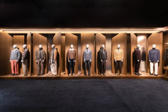 続く「Tailor’s Shop」エリアは、現代的な英国テーラーのブティックを思わせる洗練された空間で、来場者は試着を楽しみながらコレクションの精巧な構造とデザインディテールを堪能。三面鏡を用いた演出により、13体のルックが展示され、コレクション全体の世界観が立体的に表現されました。