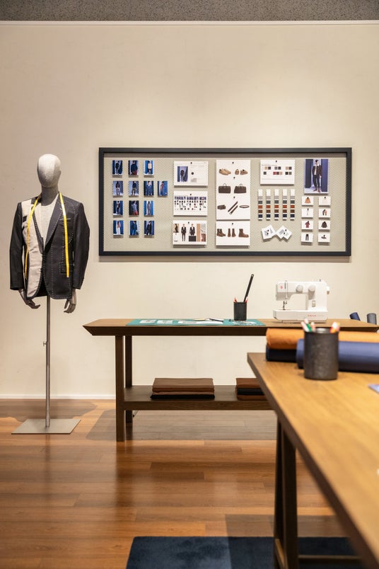 「The Studio」エリアでは、スケッチや道具、素材を通してベッカムとBOSSのコラボレーションを紹介。このエリアでは、コレクションのテーラードピースにおける高度な技術を示すため、フルキャンバスのブレザーが特別展示されました。素材やアクセサリーを並べた作業台では、コレクションのクラフトマンシップを体現。厳選された素材選定、精緻な技法、そして細部にまで及ぶ徹底したこだわり、これこそが「BECKHAM × BOSS」を定義する要素であることを示しました。
