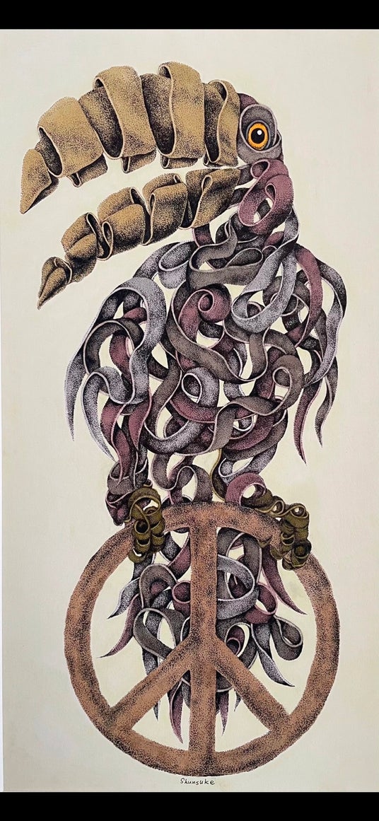 SHUNSUKEは岐阜在住。20代でアンダーグラウンドミュージックのグラフィックに衝撃を受け、CDジャケットやTシャツ、フライヤーなどのアートを多数手掛けた経歴を持ちます。現在は独自のスタイルで作品を発表し続けています。