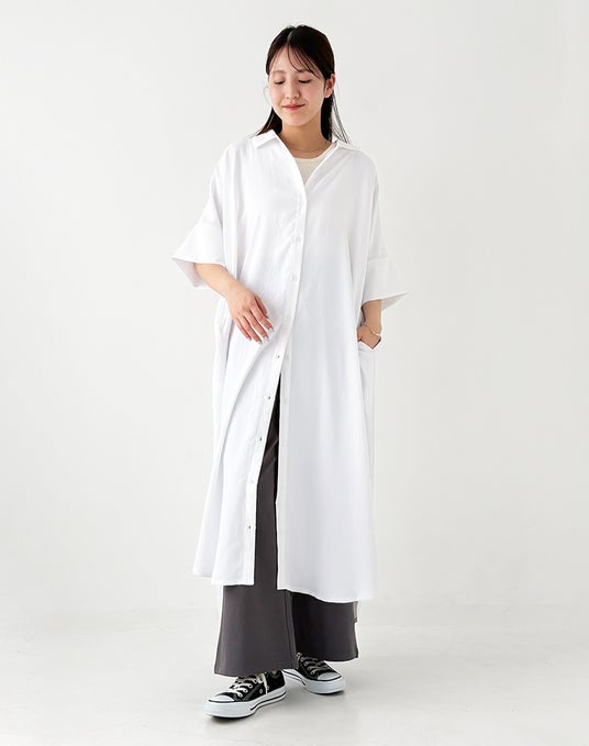 大人気シャツワンピが、汗ジミ防止機能はそのままにブラッシュアップ。両面撥水加工で、汗を気にせずホワイトやグレーのクリーンな着こなしを一日中楽しめます。小襟や後ろタックで洗練度もアップ。一枚でも、ワイドパンツとのレイヤードでもサマになります。機能とお洒落を妥協しない、夏をご機嫌にする実力派ワンピです。