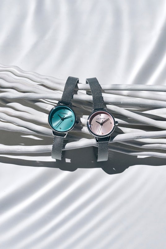 クラシックな佇まいに遊び心を添えて再構築された23mmの小さなフェイス。まるでジュエリーのように繊細な輝きを放つミニウォッチは、アクセサリーと軽やかに重ね付けをしても、一点で上品に主張しても美しいデザインです。光を受けて表情を変えるサンレイダイヤルには、さりげないクリスタルインデックスが煌めき、手元にエレガントさを与えます。ターコイズ、チョークブルー、フォレストグリーンといったバケーション気分を高めるカラーに、シルバーホワイトやシャンパンゴールドなどのニュートラルカラーを組み合わせ、洗練された夏のスタイリングを完成させます。