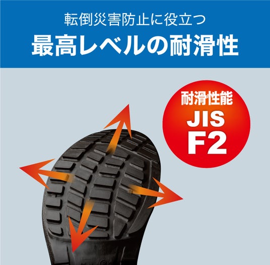 JIS規格 耐滑性能F2に合格した最高レベルの耐滑性により、濡れた路面や油で滑りやすい現場でも確実なグリップ力を発揮。また、つま先を高めに設計したことで、段差や配管などでの引っかかりによるつまずきを軽減し、転倒事故のリスクを低減します。