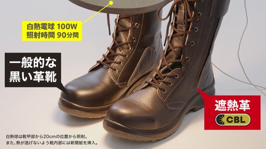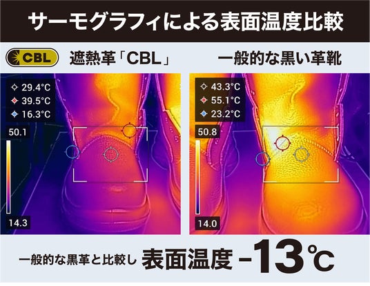 ・対象:一般的な黒革を使用した長編上安全靴と、遮熱革「CBL」を使用した同型安全靴