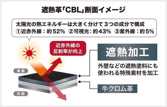 このような深刻な労働災害の現状を受け、当社では外壁・道路用の遮熱塗料技術を応用した独自の遮熱革「CBL」を開発。革の表面に遮熱塗料にも使われる特殊素材を加工することで、太陽の熱エネルギーの約半分を占める近赤外線の反射率を高め、靴内部への太陽光による熱の侵入を大幅に抑制することに成功しました。