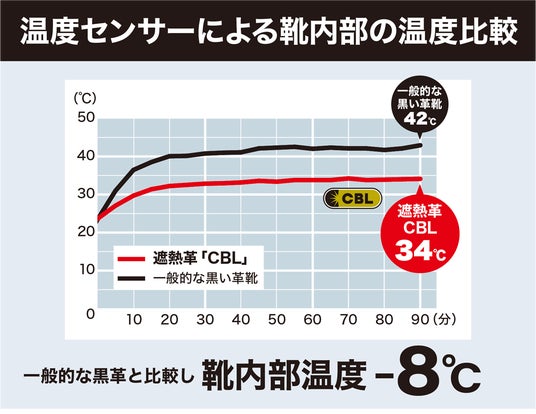 ・結果:遮熱革「CBL」使用靴では一般的な黒革靴に比べ、内部温度が最大8℃低く、靴の表面温度においても13℃の温度低減効果が確認されました。