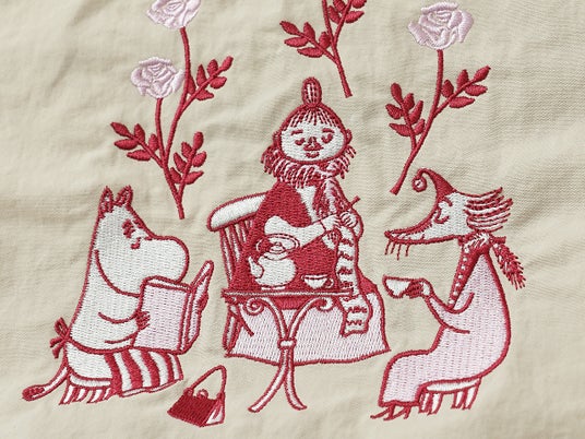 新たに登場した刺繍の柄は、ムーミンママ、ミムラ夫人、フィリフヨンカたちが、ただそこにいるだけで満たされる穏やかなひとときを、まるで一枚の絵画のような繊細な刺繍で表現しました。