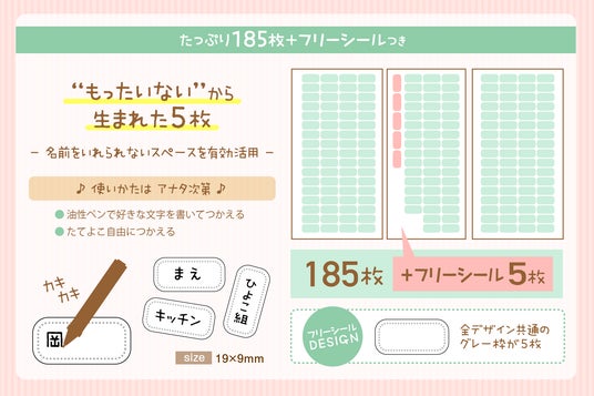 お名前を入れることができないデッドスペースを利用し、手書きで書き込める「フリースペース」を5枚つけました。「もったいない」という想いからできあがったシールです。
