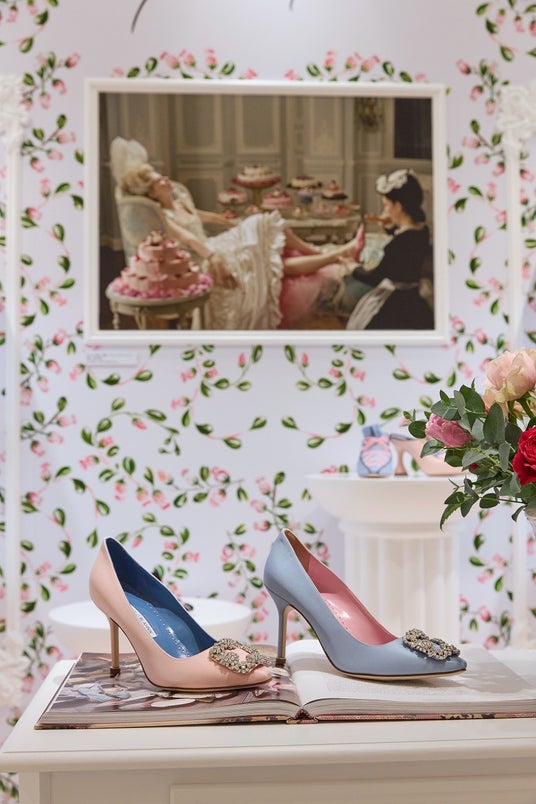この特別なカプセルコレクションは、ロココの繊細な装飾性とマノロ ブラニクの卓越したクラフツマンシップが融合した、夢のようなラインナップです。立体的なシルエット、上質で滑らかな素材、プリーツやリボンといった細やかなディテールが随所にちりばめられ、見る者の視線を奪う一足に仕上げられています。店内は、ローズバッドプリントが空間をやわらかく包み込み、ロココ調を彷彿とさせるディスプレイが、アクセントとして配されています。ピンクトーンを基調にしたムードがコレクションのロマンティックな一層引き立てます。