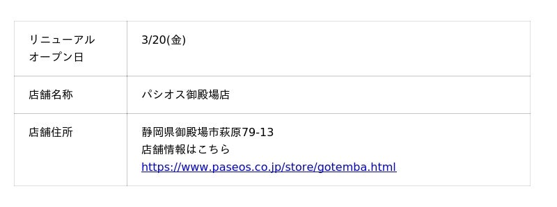 3/2(月)より改装の為休業しておりました、[パシオス御殿場店(静岡県御殿場市)]は、3/20(金)にリニューアルオープンいたします。改装し、売場が見やすく買いやすくなりました。
