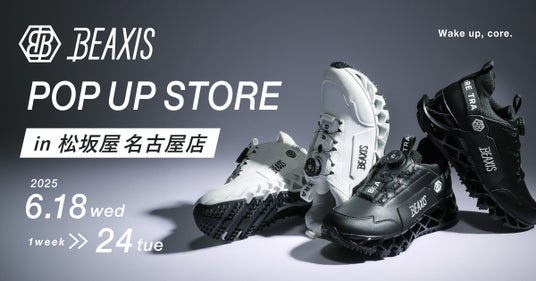 株式会社アメイズプラスが展開する "体幹ギア"ブランド BEAXIS(ビーアクシス)は、6/18(水)~6/24(火)の1週間、松坂屋名古屋店にてPOPUP STOREを開催します。ゴルフ用のシューズに加えて新商品のアパレルを含めた全15商品を販売します。
