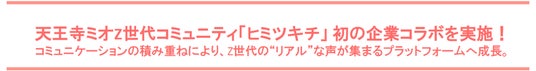 JR西日本SC開発株式会社(本社:大阪市北区梅田)が運営する大型ショッピングセンター「天王寺ミオ」のZ世代社員が立ち上げた、Z世代が運営する、Z世代のためのプロジェクト「ヒミツキチ」では、コミュニティ設立以来初となる企業コラボを実施。アイテムに関する本音の発掘と、コミュニティの活性化に繋げました。