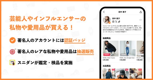 「SNKRDUNK(スニーカーダンク)」(以下、スニダン)を運営する株式会社SODA(本社:東京都渋谷区、代表取締役CEO:内山 雄太、以下SODA)は、2025年7月8日より、著名人の「アカウント認証サービス」を開始いたします。これにより、スニダンで芸能人やインフルエンサーが出品する私物や愛用品の購入が可能になり、ファンや購入者にとって価値のあるアイテムを手に入れていただくことができるようになります。