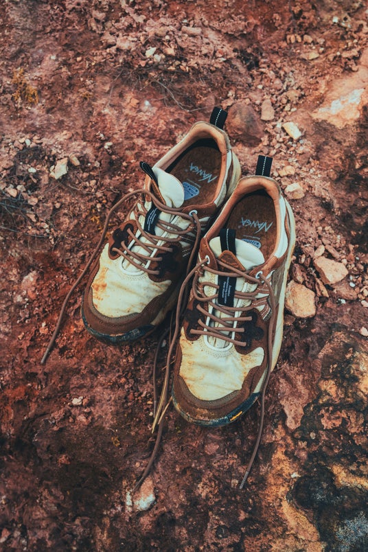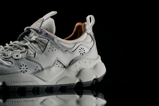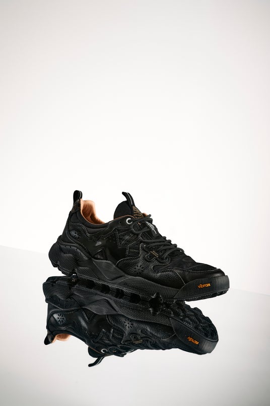 踵部には”NANGA”の刻印が施され、アイレットステイとシュータンにはヌメ革のFlower MOUNTAINのモチーフを配し、両ブランドのアイコニックなDNAが凝縮されたデザインとなっている。