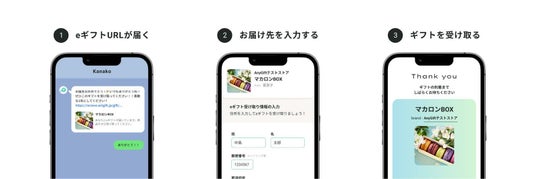 1)届いたURLを開くと受け取り画面が表示されます。「eギフトを受け取る」 を選択してお届 け先情報の入力に進みます。 2)お届け先情報をご入力ください。※入力した情報が、贈り主に伝わることはございません。 3)入力したお届け先に、eギフト商品が配送されます。