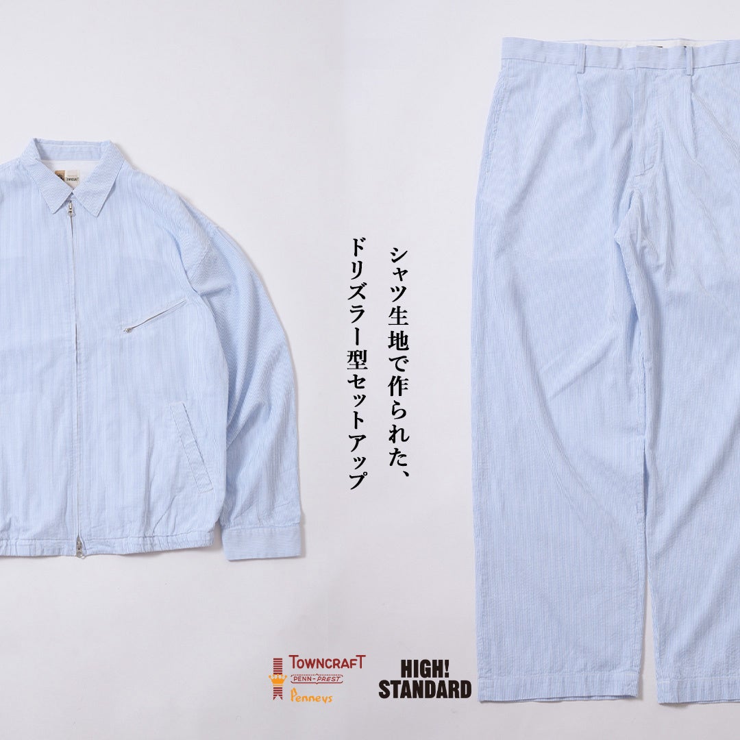 古き良きアメリカの空気感を体現する〈TOWNCRAFT〉のデザイン性と、アメリカンベーシックを追求する〈HIGH! STANDARD〉のモノ作りの姿勢を融合。清涼感のあるコットン100%のシアサッカー素材で統一し、春夏に適したセットアップとして完成させました。